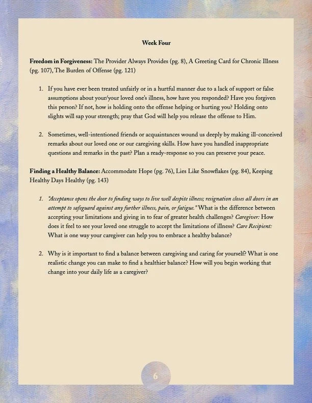 I’ve created a free Incurable Faith caregiver guide to encourage and uplift those who help others. Those who prefer to print a downloadable pdf may use this link: Incurable Faith Caregiver Guide. Please feel free to forward this guide to anyone who might benefit from it!